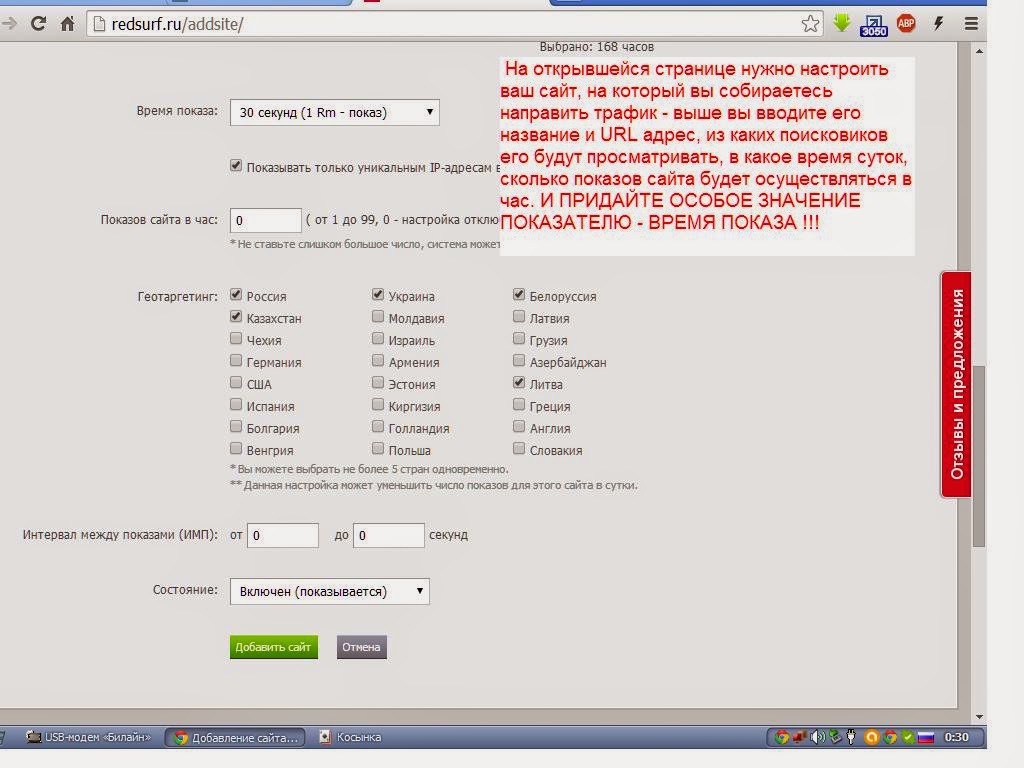 После добавления сайта/сайтов нужно настроить их показы - ввести название сайта (любое), его адрес, настроить ИЗ КАКИХ ИМЕННО поисковиков будут приходить люди, можно настроить (в большинстве случаев необязательно) ПО КАКИМ ЗАПРОСАМ будут приходить люди, из каких ГОСУДАРСТВ (их можно выбрать 5 штук, обычно я добавляю 3 русскоязычных и иногда США и Германию или Израиль).